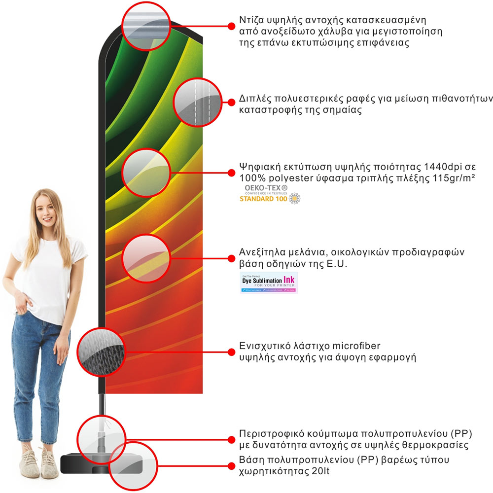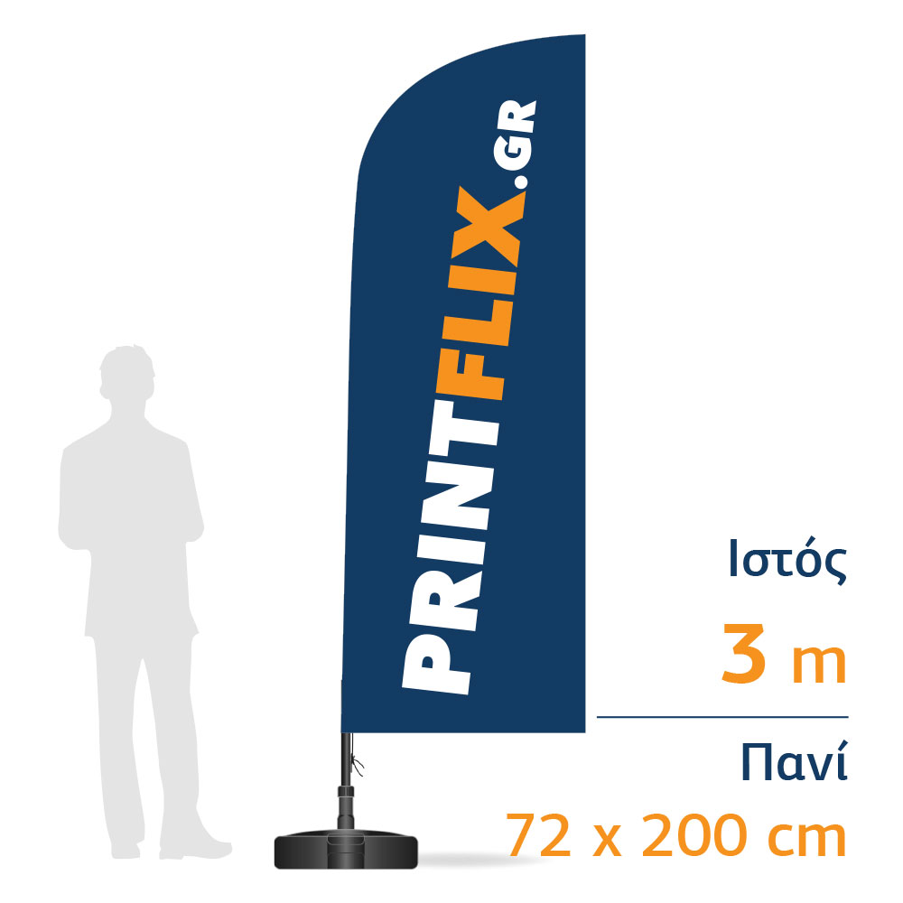 Γενικές πληροφορίες: Τα διαφημιστικά ιστία Beach Flag περιλαμβάνουν ενισχυμένο πάσσαλο αλουμινίου, ψηφιακή εκτύπωση (δεν υπάρχει κάποιος περιορισμός στην ποσότητα χρωμάτων), ιστό, και βάση που γεμίζει με νερό. Εναλλακτικά μπορείτε να παραγγείλετε βάση για χιόνι ή βάση για χώμα. Είναι η οικονομικότερη λύση για την τοποθέτηση μίας “μεταφερόμενης επιγραφής” με τεράστια απόδοση στο χώρο σας.