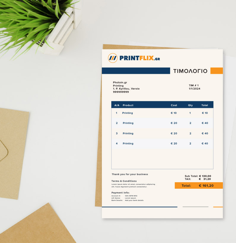 Αναδείξτε την επιχείρηση σας με τιμολόγια που φέρουν το λογότυπο και τα στοιχεία σας για να αποκτήστε μια ολοκληρωμένη εταιρική ταυτότητα.